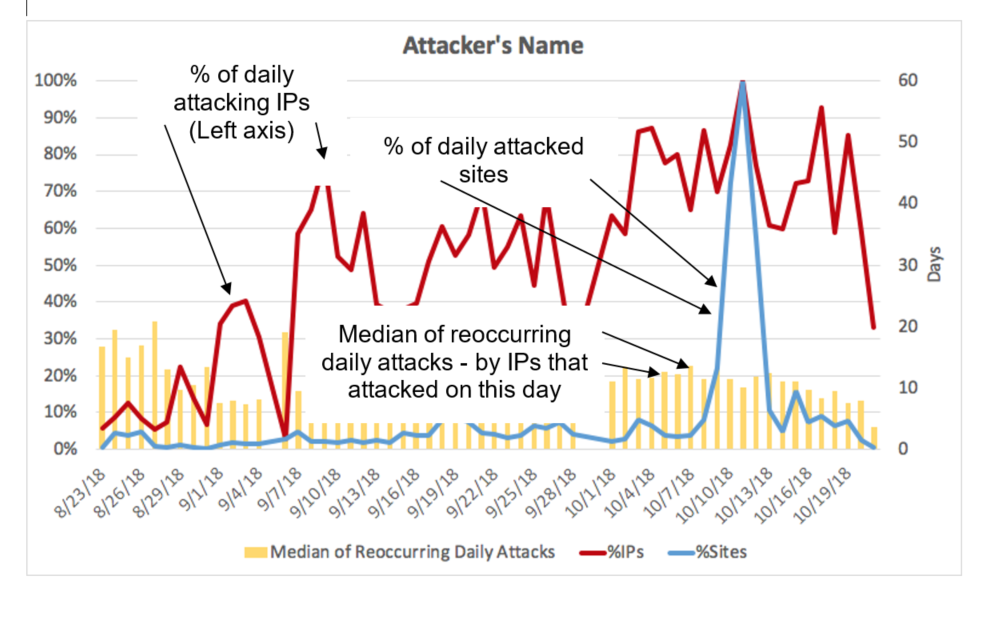Similarly, the blue line represents the percentage (left axis) of attacked sites on any day, calculated by dividing the number of protected sites attacked that day by the highest number of protected sites attacked during this timeframe. The yellow bars represent the median (right axis) number of days all of the attacking IPs on that day have attacked overall during the studied timeframe. For instance, if 30 IPs attacked on one day and the median number shown is 10, that means 15 IPs have attacked more than 10 days, and 15 IPs have attacked fewer than 10 days.