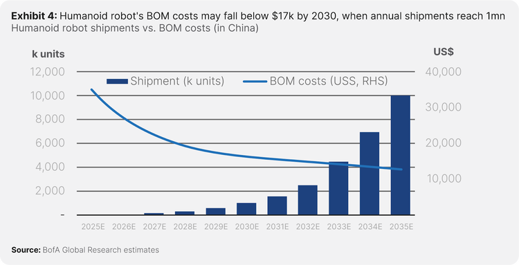 Figure 3: Projected cost reductions associated with large-scale production increases (Source: Bank of America Institute “Humanoid Robots 101”)