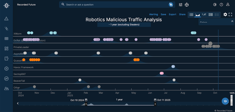Furthermore, unlike other countries that have attempted to offset labor shortages through immigration, China’s policy has been more focused on finding a technological solution rather than importing labor. China’s long-term planning and economic strategy appear to be increasingly focused on robotics, and it has spent the last decade preparing its industrial base to mass-produce robots. It comes as no surprise that Recorded Future’s Network Intelligence continues to reveal state–linked malware families targeting the robotics industry, likely seeking to acquire sensitive intellectual property.