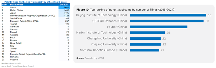 Figure 5: China leading with patent filings mentioning humanoid robots 2020-25 (left) (Source: Morgan Stanley, “The Humanoid 100”); graph showing the organisations that are filing for humanoid technological development (right) (Source: MITSUI & CO. “Humanoid Robots”)