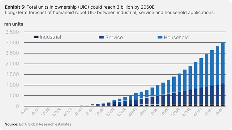 Figure 7: Projected global ownership of humanoid robots, potentially reaching billions by 2060 (Source: Bank of America Institute “Humanoid Robots 101”)