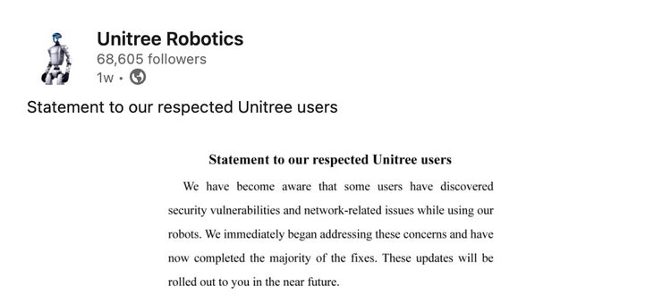 Figure 8: Statement from Unitree Robotics regarding the security vulnerabilities in their robots in October 2025 (Source: Unitree Robotics LinkedIn Post)