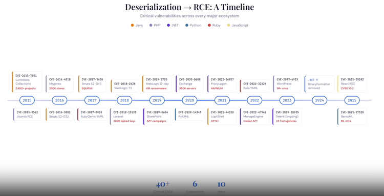 Timeline illustrating the deserialization vulnerability impacts of 40+ critical CVEs across 6 ecosystems, over the course of 10 years.