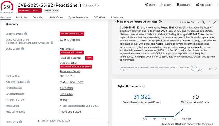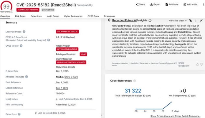 CVE-2025-55182 Intelligence Card c/o Recorded Future