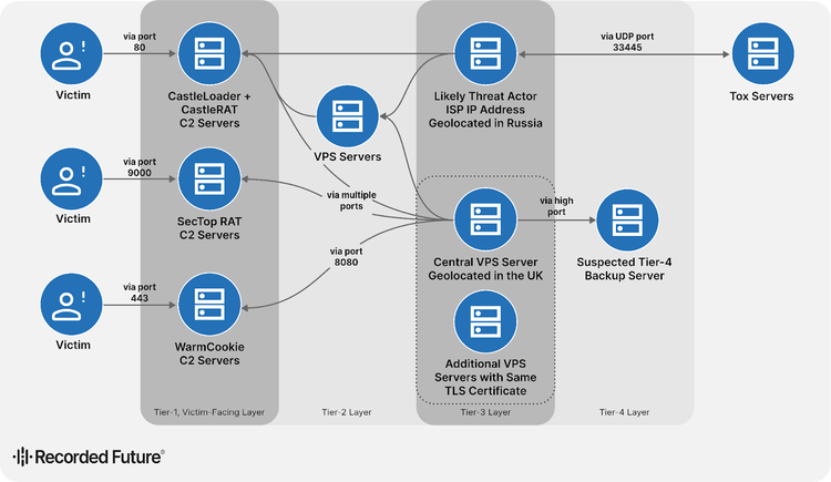 Insikt Group previously identified an extensive, multi-tiered infrastructure tied to GrayBravo. The infrastructure consists of Tier 1 victim-facing C2 servers associated with malware families such as CastleLoader, SecTopRAT, WarmCookie, and the newly discovered CastleRAT, as well as Tier 2, Tier 3, and Tier 4 servers, the latter of which are likely used for backup purposes. Figure 2 provides an overview of the infrastructure used by GrayBravo.