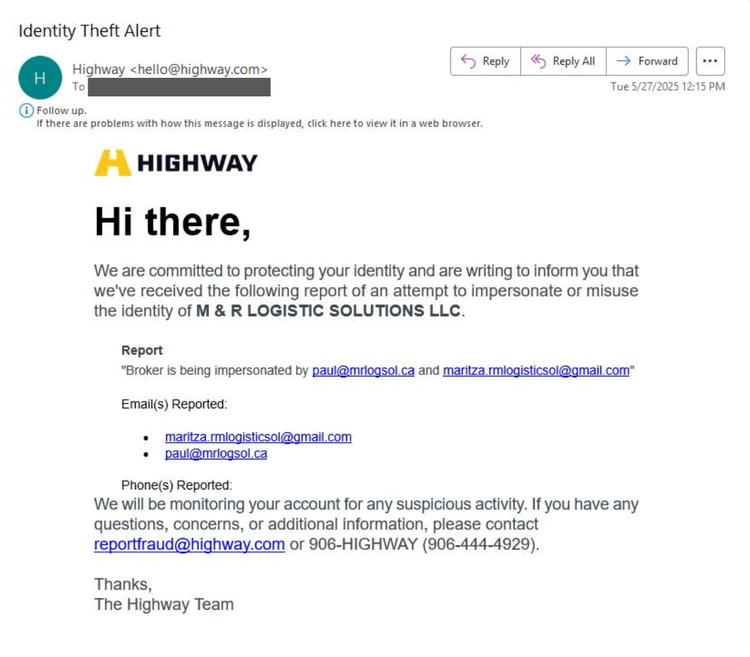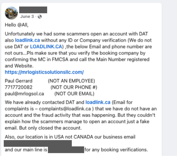 In another instance, Insikt Group identified a post from an employee of a legitimate logistics company based in Rhode Island, USA, describing an incident in which a threat actor created accounts impersonating their company on DAT Freight & Analytics (dat.com) and Loadlink Technologies (loadlink.ca), both platforms operating in the freight matching industry (see Figure 13). The fraudulent registrations used fake company information, including the email address paul[@]mrlogsol[.]ca, which is associated with Cluster 1–linked infrastructure. Notably, in line with Cluster 1’s typical patterns, the email addresses used in these operations often consist of only a first name (for example, Paul). The employee reported having contacted both DAT and Loadlink to alert them to the fraudulent activity.