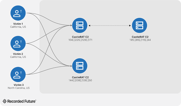 Analysis of CastleRAT C-variant command-and-control (C2) infrastructure reveals notable operational overlap across multiple nodes sharing the RC4 key “NanuchkaUpyachka.” As illustrated in Figure 3, Insikt Group observed two CastleRAT C2 servers, 104[.]225[.]129[.]171 and 144[.]208[.]126[.]50, maintain concurrent communications with at least three US-based victims, suggesting coordinated or redundant control channels. The overlapping traffic patterns, observed within the same daily collection windows, indicate that compromised hosts reached out to multiple C2s nearly simultaneously rather than migrating between them over time. This behavior implies a deliberate redundancy strategy employed by the threat actor. Additionally, direct communications between two CastleRAT C variants, 104[.]225[.]129[.]171 and 195[.]85[.]115[.]44, further point to an interconnected infrastructure ecosystem rather than isolated C2 instances. Such internal connectivity could facilitate automated data synchronization, lateral control distribution, or key exchange mechanisms within the threat actor’s tooling, underscoring a more mature coordinated operational model than previously documented.