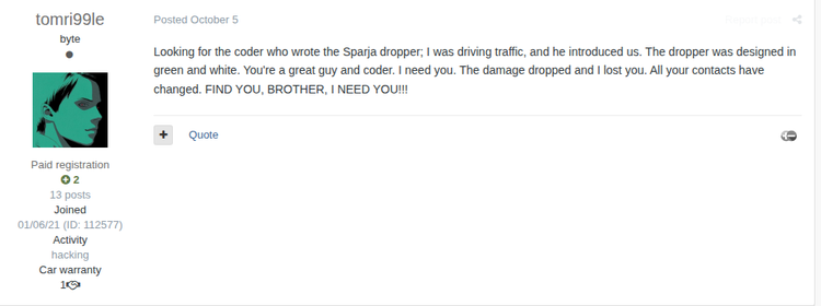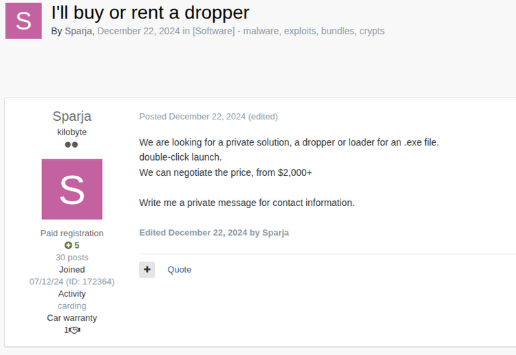 Matanbuchus is a C-based downloader MaaS available since 2021. One of its primary objectives is secrecy, which is in part fostered by limiting sales to a select number of customers. Currently at version three, it is continually maintained and improved by its creator BelialDemon. BelialDemon offers Matanbuchus 3.0 as a monthly rental service with two pricing tiers based on the communication protocol: $10,000 per month for the HTTPS-based version and $15,000 per month for the DNS-based version.