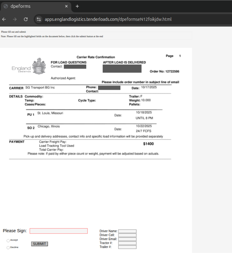 Access to platforms like DAT Freight & Analytics and Loadlink Technologies not only enables the threat actors to enhance the appearance of legitimacy, allowing them to maintain plausible profiles should potential victims attempt verification, but also provides opportunities to gather contact information for prospective targets and obtain additional contextual data, such as details on specific loads, dates and times, documents, or related materials, which can then be repurposed as spearphishing lures. In addition, although not verified in this specific case, the threat actors may also post fraudulent load listings containing malicious content, potentially resulting in malware infections.