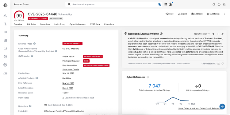 Figure 1: Vulnerability Intelligence Card® for CVE-2025-64446 in Recorded Future (Source: Recorded Future)