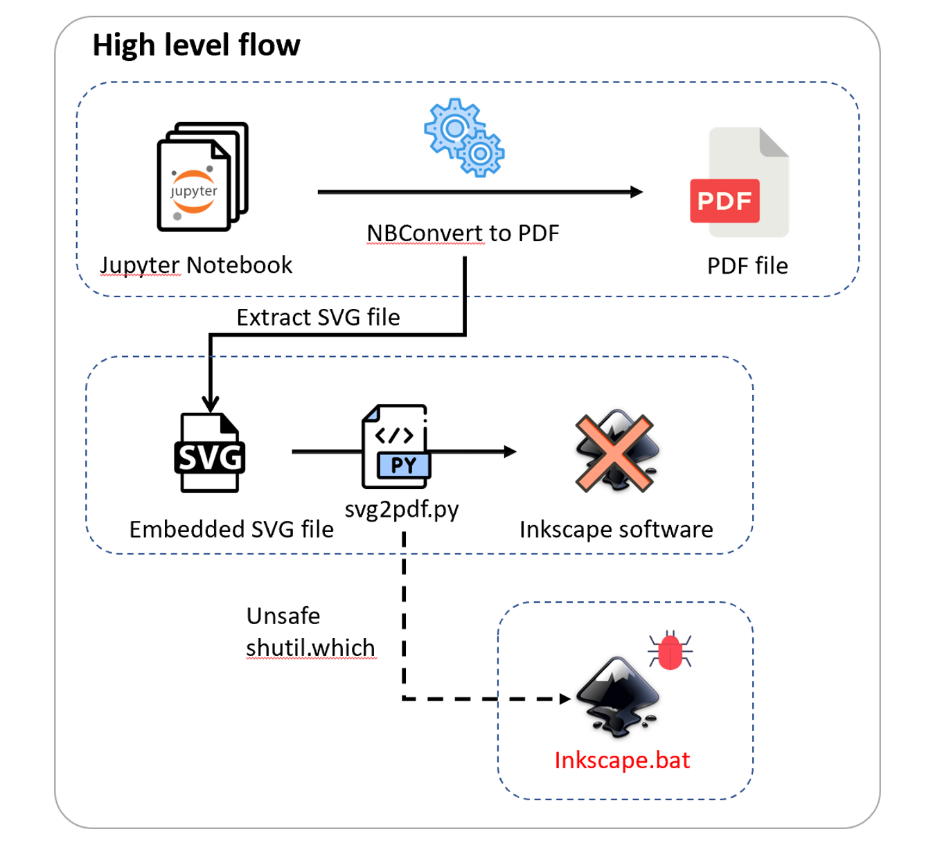 without including inkscape anywhere as a mandatory nbconvert dependency. This opened the door to unintended code execution as the following figure shows: