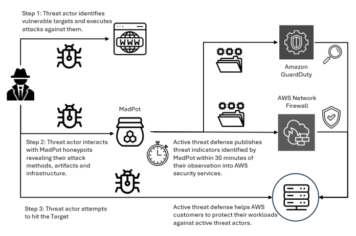 AWS active threat defense for Network Firewall uses MadPot intelligence and multi-layered protection to disrupt attacker kill chains and reduce the operational burden for security teams. With automated rule deployment, active threat defense creates multi-layered defenses within 30 minutes of new threats being detected by MadPot. Amazon GuardDuty customers automatically receive threat detection findings when workloads attempt to communicate with malicious infrastructure identified by active threat defense, while AWS Network Firewall customers can actively block these threats using the active threat defense managed rule group. To get started, see Improve your security posture using Amazon threat intelligence on AWS Network Firewall.