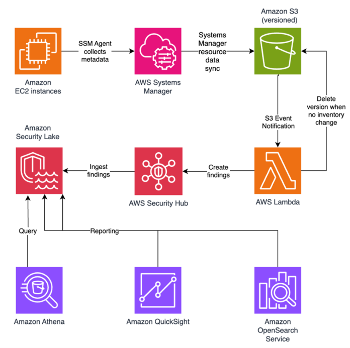 While this post uses a single-account, single-Region setup for simplicity, Security Lake supports collecting data across multiple accounts and Regions using AWS Organizations. You can also use a Systems Manager resource data sync to send inventory data to a central S3 bucket.