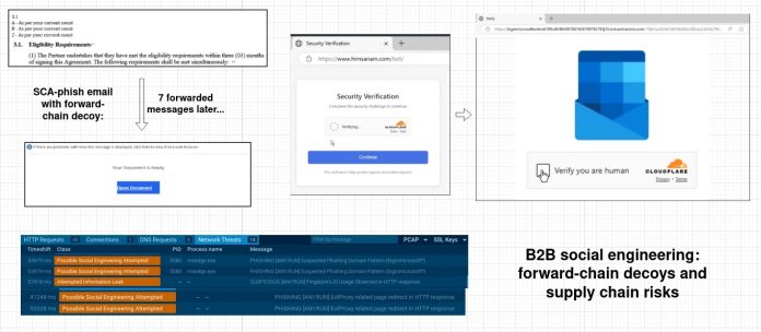The attack unfolds through layered social engineering. It begins with a supply chain attack (SCA) phishing email sent to the contractor. This triggers seven forwarded messages, building plausibility as the payload ripples through internal channels.