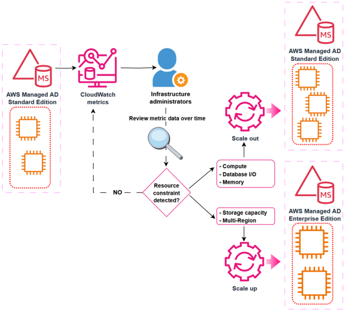 Scale-up—also called upgrading your AWS Managed Microsoft AD—means changing the edition of an AWS Managed Microsoft AD from Standard to Enterprise. Enterprise Edition delivers larger domain controller instances, with higher compute capacity and larger storage for Active Directory objects. When a directory scales up, it retains the same number of domain controller instances that it previously had with larger quotas. Instances are replaced one at a time to minimize disruptions to production workflows.