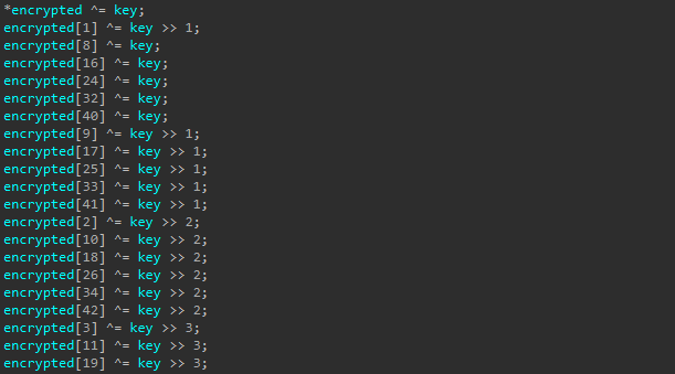 data = b'?N\\xd9\\x8c$\\x1d}\\xed\\x1c4\\x00\\x00\\x00\\x00\\x00\\x00' key = 0x8145F15287224668 decrypted_size = 10 decrypted = bytes( data[i] ^ (key >> i % 8) & 0xFF for i in range(0, decrypted_size) ) print(decrypted) # b'WzCAB.dat\\x00'