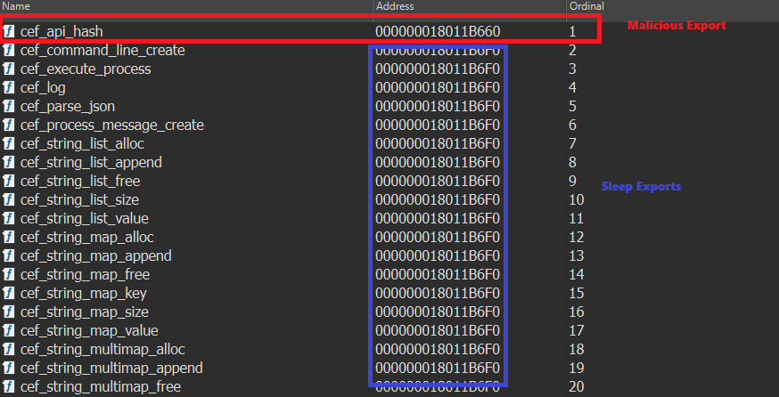 The DLL typically contains multiple exports, in most cases, only a single export is functional, and the remaining exports point to the same address, which simply invokes an infinite Sleep loop.