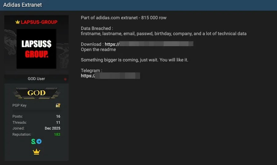 Adidas has confirmed it is actively investigating a potential data breach involving one of its independent third-party partners after a threat actor operating under the alias “LAPSUS-GROUP” posted claims on BreachForums on February 16, 2026, alleging unauthorized access to the sportswear giant’s extranet portal.