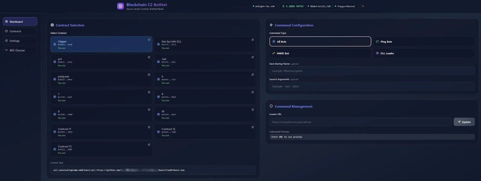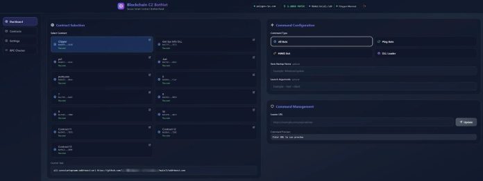 The operator manages everything through a web-based control panel. From this interface, the attacker selects a smart contract, picks a command type — whether targeting all bots, pinging a specific machine by hardware ID (HWID), or pushing a DLL loader — then provides a payload URL and publishes the update to the blockchain.