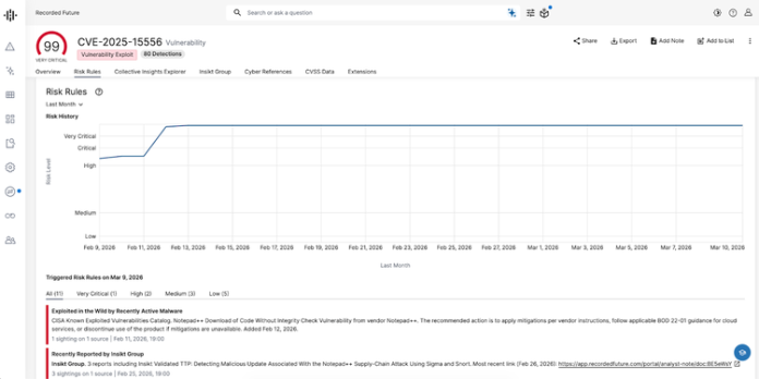 February 2026 saw a 43% decrease in high-impact vulnerabilities, with Recorded Future’s Insikt Group® identifying 13 vulnerabilities requiring immediate remediation, down from 23 in January 2026. All 13 carried a Very Critical Recorded Future Risk Score.