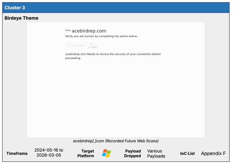 Cluster 3 was observed operating from May 2024 until the time of writing. Previously reported on by Insikt Group, this cluster uses infrastructure centered on domains incorporating the keyword “bird” to deliver its ClickFix lure pages, trackable in Recorded Future’s HTML Content Analysis. These lures spoof Birdeye, an AI marketing company, to manipulate victims into executing malicious commands.
