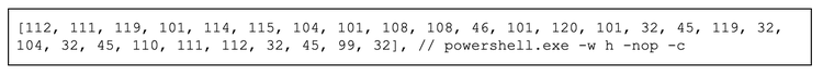 Analysis of the JavaScript within the DOM for this cluster, provided in Appendix F, revealed insights into the threat actor’s methods. A notable portion of the script uses seven obfuscated lines that are concatenated into a single string to be attached to the victim’s clipboard. The developer left comments within the code that detail the deobfuscated purpose of each line. For example, one comment explicitly identifies the portion of the command calling PowerShell with specific flags (Figure 13).
