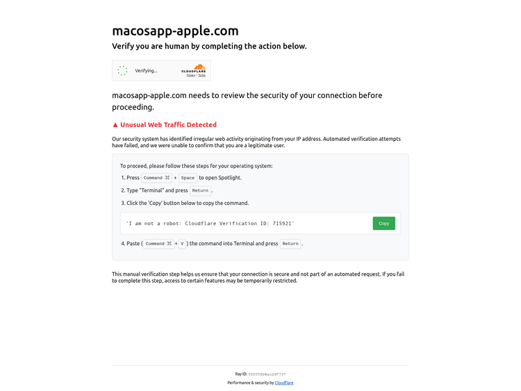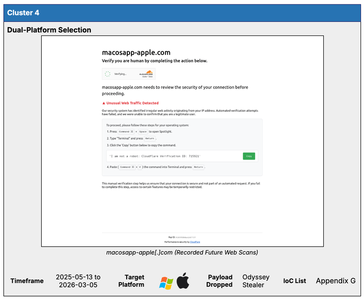 Cluster 4 was observed operating from March 2025 to the time of writing. This cluster is unique for its use of operating system detection to deliver tailored ClickFix lures for both Windows and macOS users. Unlike standard ClickFix behavior that typically pushes commands to the clipboard automatically, this variant provides detailed manual instructions, requiring the victim to open native system tools and manually copy and paste the provided staging payload. One of the ClickFix pages used to analyze this behavior was macosapp-apple[.]com, hosted at IP address 45[.]144[.]233[.]192.