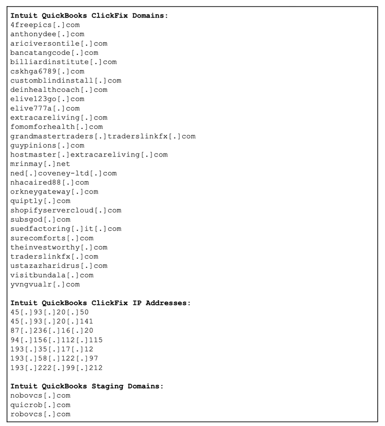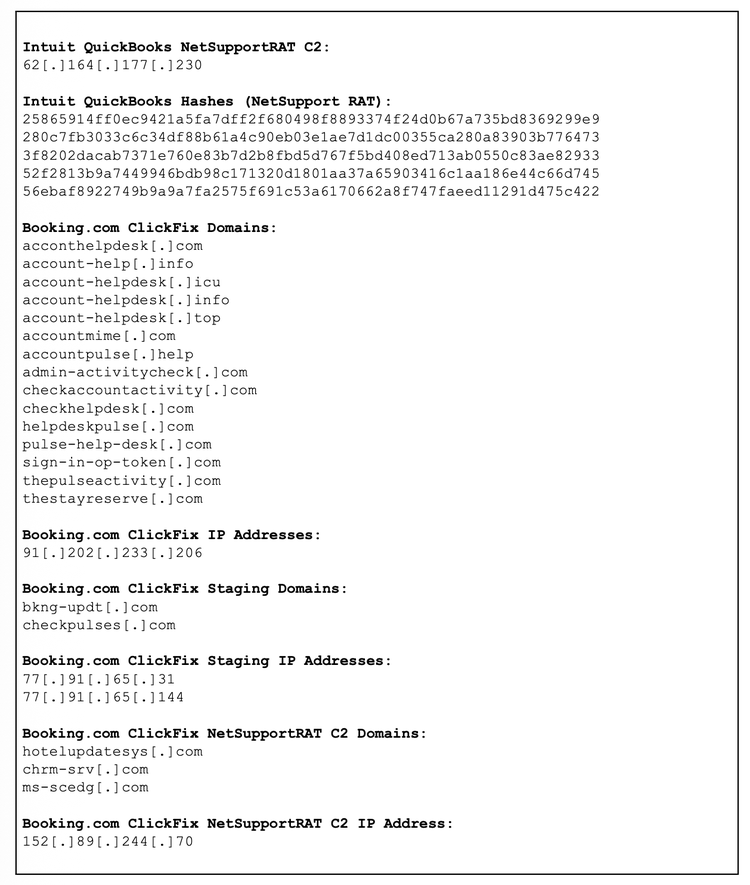 Insikt Group identified five distinct clusters leveraging the ClickFix social engineering technique to facilitate initial access to host systems. Observed since at least May 2024, these clusters include those impersonating financial application Intuit QuickBooks and the travel agency Booking.com. Insikt Group leveraged the Recorded Future® HTML Content Analysis dataset, which enables systematic monitoring of embedded web artifacts to identify and track new malicious domains and infrastructure.