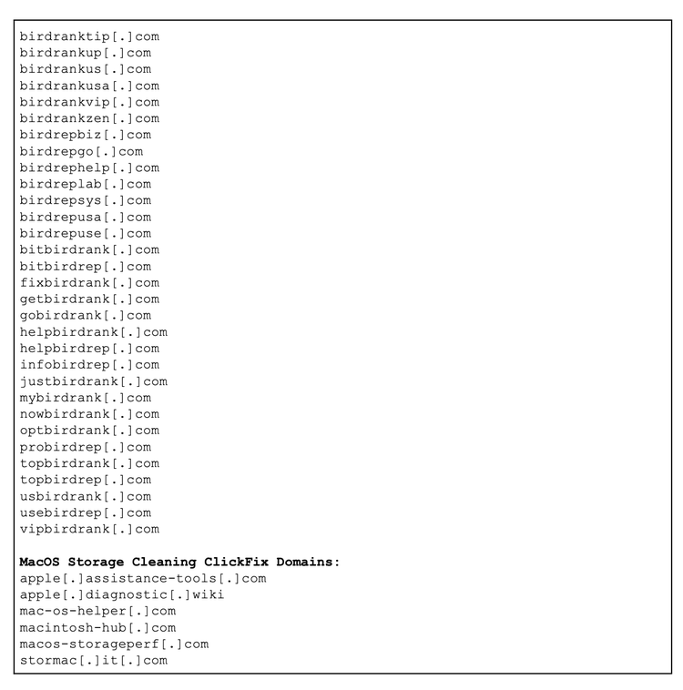 Based on historic evidence (1, 2) and forensic patterns, Insikt Group assesses with high confidence that the information stealer MacSync was the primary payload used to infect victims in this cluster. The malicious commands on these pages caused the infected systems to reach out to a specific set of staging and C2 infrastructure, detailed in Table 11. Notably, while the domains varied, they were frequently observed behind Cloudflare to complicate network-level blocking.