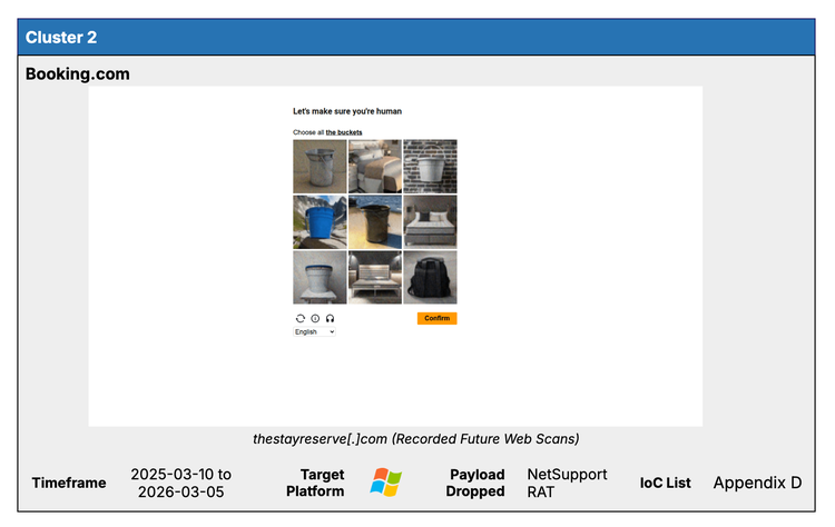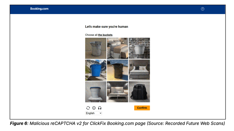Cluster 2 was observed operating from February 2026 to the time of writing, impersonating the travel agency Booking.com. Insikt Group tracked the cluster by pivoting on a unique DOM hash made possible by the threat actor’s repeated use of a unique HTML title and consistent image files. Indicators of compromise (IoCs) tagged in this cluster can be seen in the Recorded Future HTML Content Analysis. The landing pages for this cluster use a counterfeit reCAPTCHA v2 challenge, requiring victims to select all photos containing a “bucket” (Figure 6). Insikt Group observed that the same challenge photos are presented in the same order across all analyzed pages.