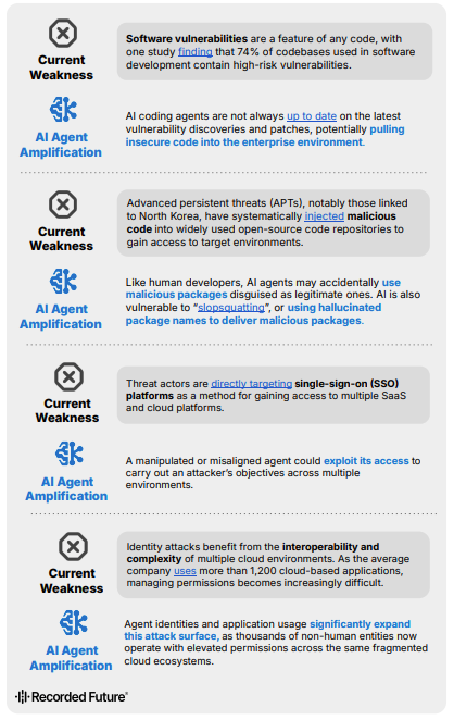 Agentic AI will exacerbate existing weaknesses in software supply chains, as vulnerable or malicious open-source components can be deployed faster and at scale.